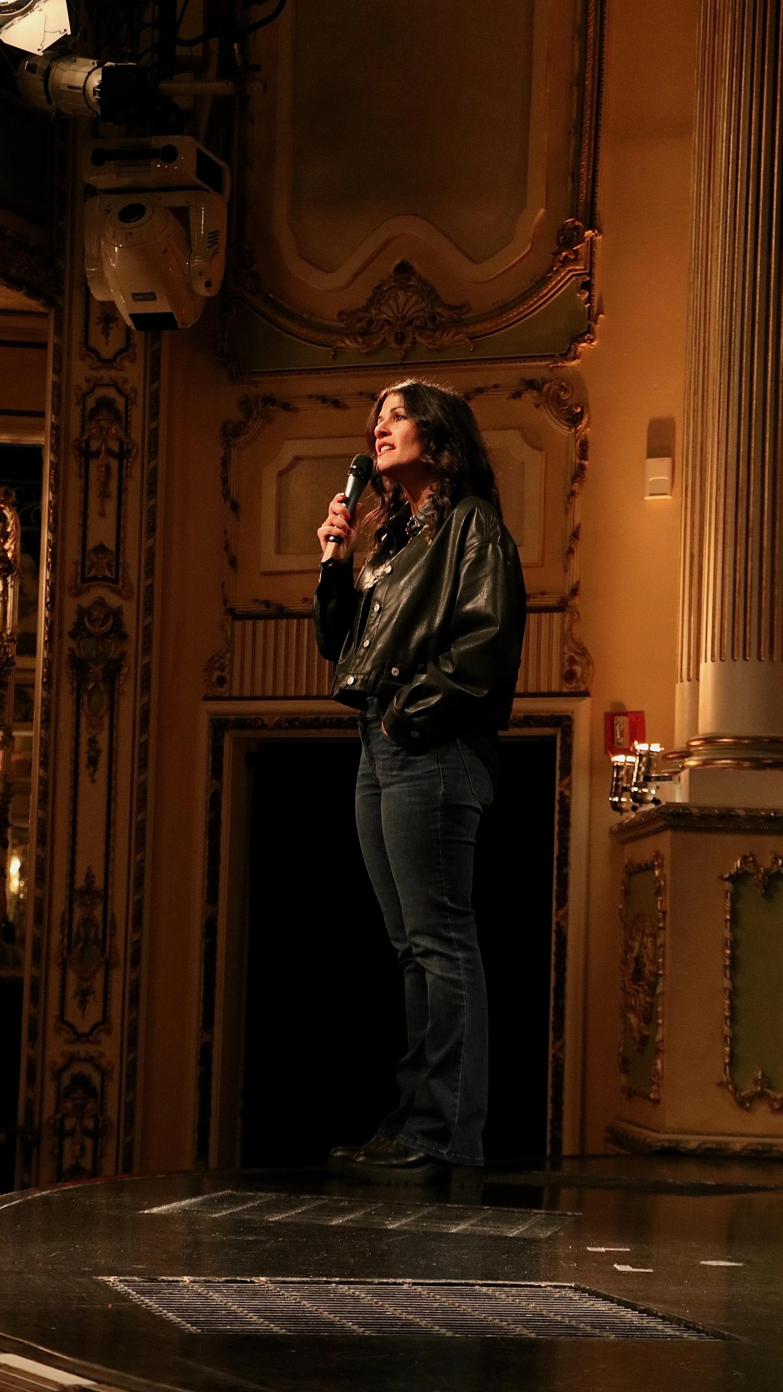 Two speakers, a woman with short dark hair and a man with a beard, holding microphones and smiling during a presentation or performance on stage, with a DJ or sound technician visible in the background.